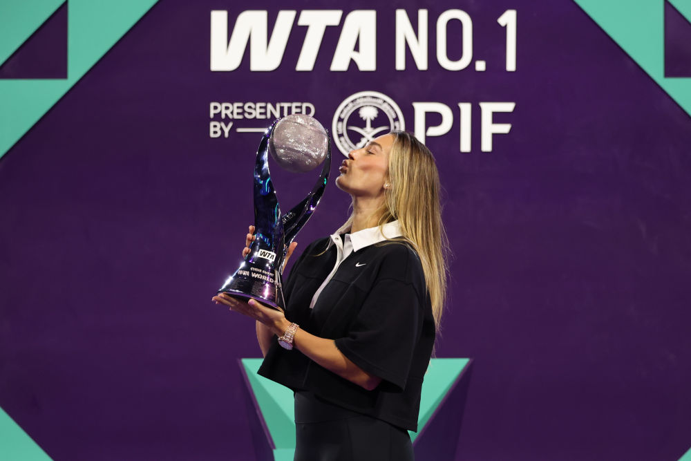 11月1日,萨巴伦卡在仪式上亲吻奖杯庆祝。当日,在沙特阿拉伯首都利雅得举行的2025年女子网球协会(WTA)年终总决赛揭幕战前,由于白俄罗斯选手萨巴伦卡已提前锁定年终世界第一,WTA为其举行奖杯颁发仪式。新华社记者 罗晨 摄