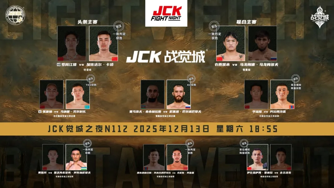 2025年12月13日,JCK觉城之夜N112结束,头条主赛加依达尔·卡哈一致判定胜罗周江措;联合主赛衣西俄木一致判定胜马戈梅德·马戈梅多夫;正赛部分尼基塔·巴尔塔巴耶夫KO贾马洛夫·希希赫拉斯;副赛部分阿拉腾沙盖、伊比热伊姆·赛迪拉分别背后裸绞降服取胜,贾沃克希贝克·阿布加尼耶夫、尤尼斯·阿查基均一致判定战胜对手。