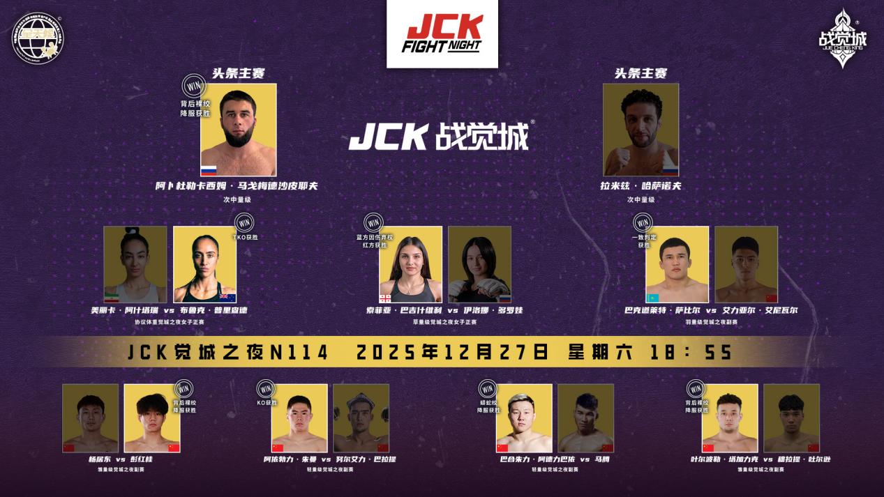 2025年12月27日,JCK觉城之夜N114结束,头条主赛阿卜杜勒卡西姆·马戈梅德沙皮耶夫背后裸绞降服拉米兹·哈萨诺夫;正赛部分布鲁克·普里查德、索菲亚·巴吉什维利分别获胜;副赛部分巴克道莱特·萨比尔一致判定战胜艾力亚尔·艾尼瓦尔,彭红桂、叶尔波勒·塔加力克均背后裸绞降服对手,阿依勃力·朱曼KO努尔艾力·巴拉提,巴合朱力·阿德力巴依蟒蛇绞降服马腾。