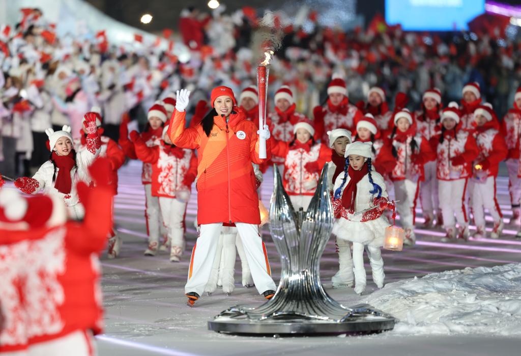 2月7日,第九届亚洲冬季运动会开幕式在哈尔滨举行,图为第四棒火炬手张虹准备点燃主火炬。新华社记者 张涛 摄