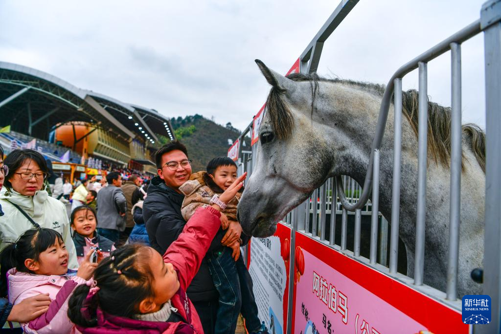 1月1日,孩子们在贵州省三都水族自治县“村马”比赛现场与马匹互动。