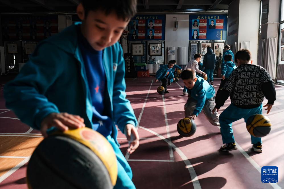 图为在新疆乌鲁木齐市第一小学,学生在体育课上练习篮球运球(2025年2月24日摄)。