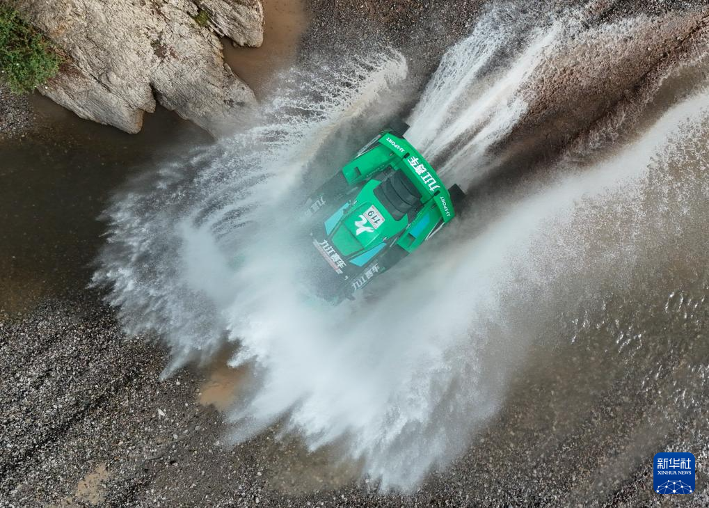 2025年5月23日,河北迁安九江汽摩运动俱乐部车手赵玉乔、领航员桂海波驾驶赛车在比赛中(无人机照片)。