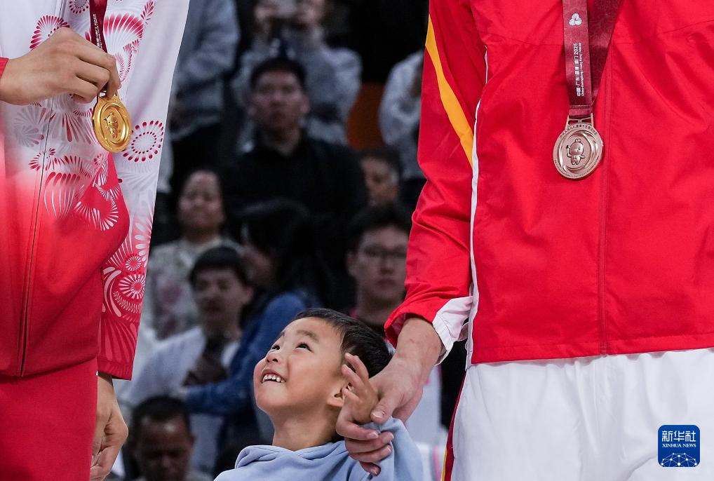 2025年11月12日,四川队球员周琦(右)的孩子看着广东队球员沈梓捷(左)的金牌。
