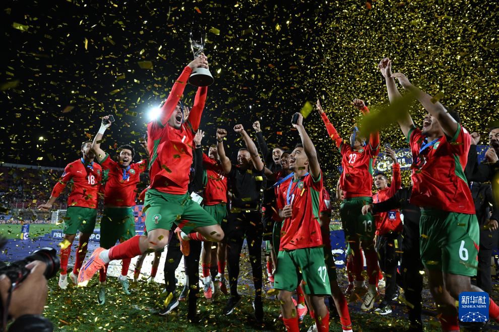 当日,在智利圣地亚哥进行的2025国际足联U20男足世界杯决赛中,摩洛哥队2比0战胜阿根廷队,获得冠军。