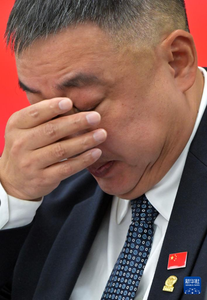 2025年4月23日,刘国梁发言时擦拭泪水。