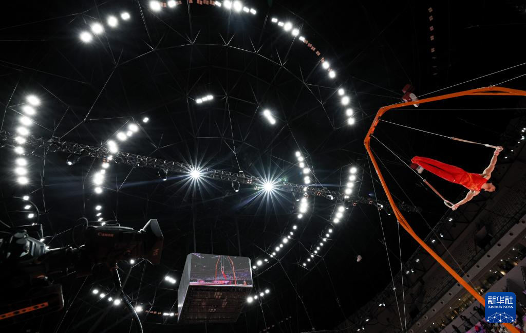 2025年10月22日,张博恒在男子个人全能决赛吊环项目比赛中。