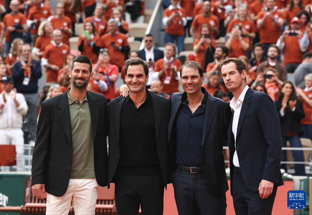 2025年5月25日,焦科维奇、费德勒、纳达尔和穆雷(从左至右)在致敬仪式上合影。