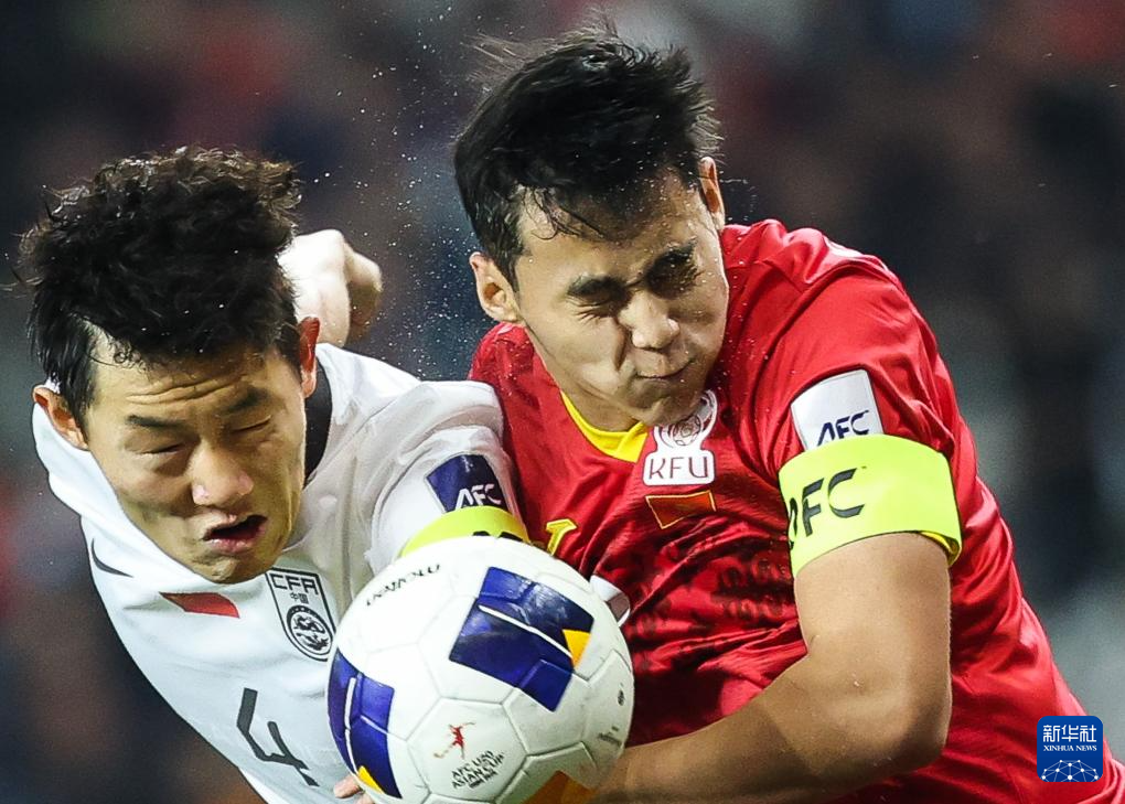 2025年2月15日,中国队球员史松宸(左)与吉尔吉斯斯坦队球员克德尔沙耶夫在比赛中争顶。
