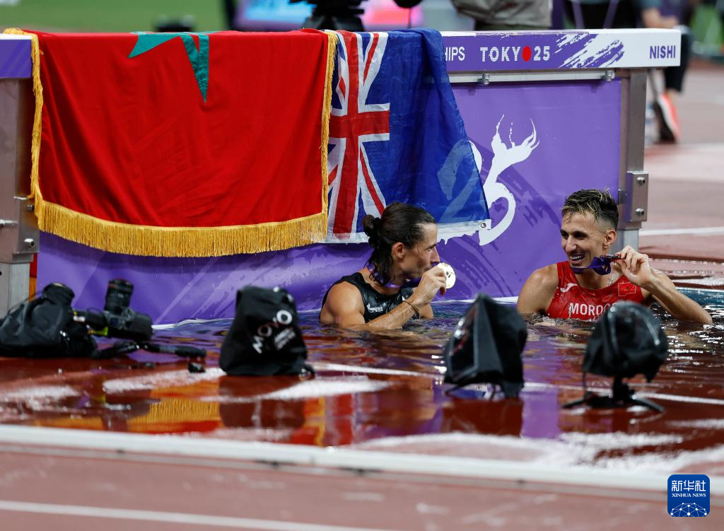 2025年9月15日,冠军新西兰选手比米什(左)和亚军摩洛哥选手艾尔巴卡里在赛后跳进水池庆祝。