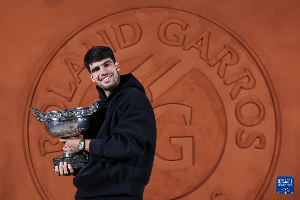 2025年6月8日,阿尔卡拉斯在拍照仪式上与奖杯合影。