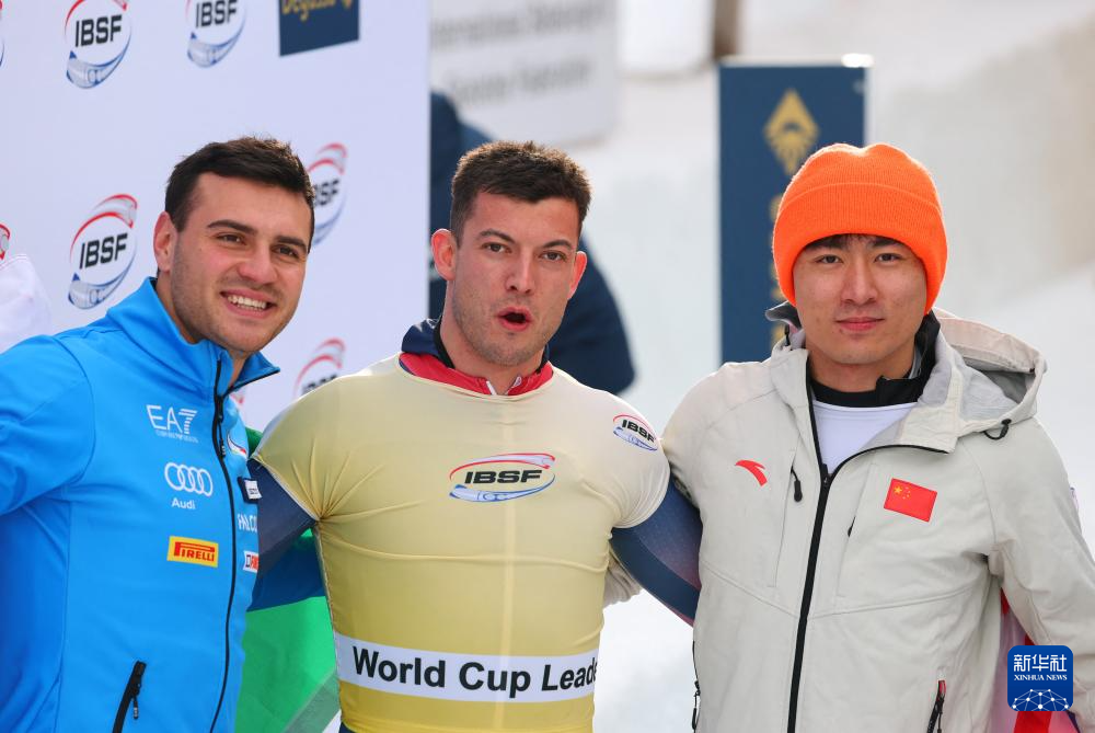 1月9日,冠军英国选手韦斯顿(中)、亚军意大利选手巴尼(左)和季军中国选手殷正在男子钢架雪车比赛后合影。