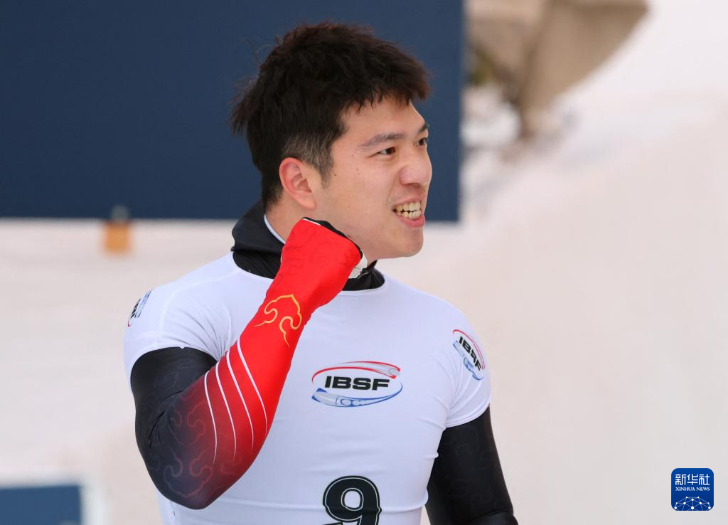 1月9日,中国选手殷正在男子钢架雪车第二轮比赛后庆祝。