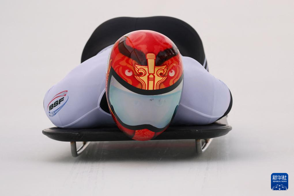 1月9日,中国选手殷正在男子钢架雪车第一轮比赛中。