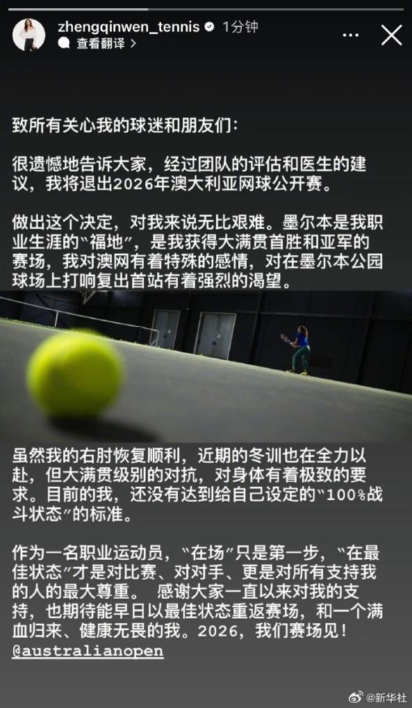 中国金花郑钦文因伤病尚未完全恢复