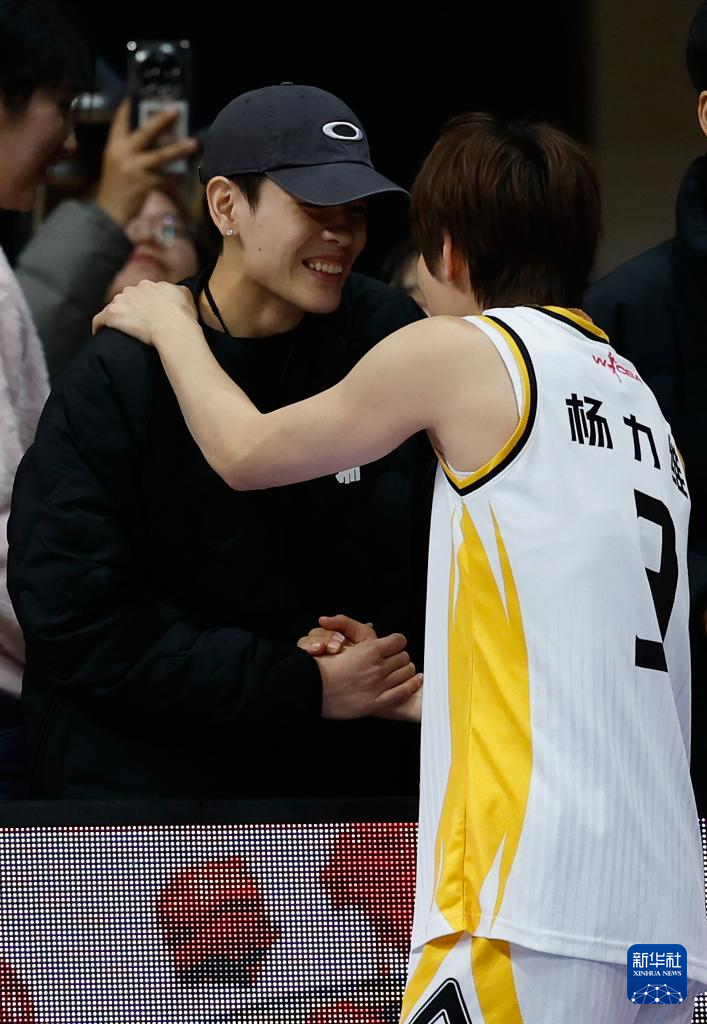 1月20日,参加女篮国家队集训的广东东莞新彤盛队球员杨舒予(后)在开赛前与姐姐杨力维拥抱。