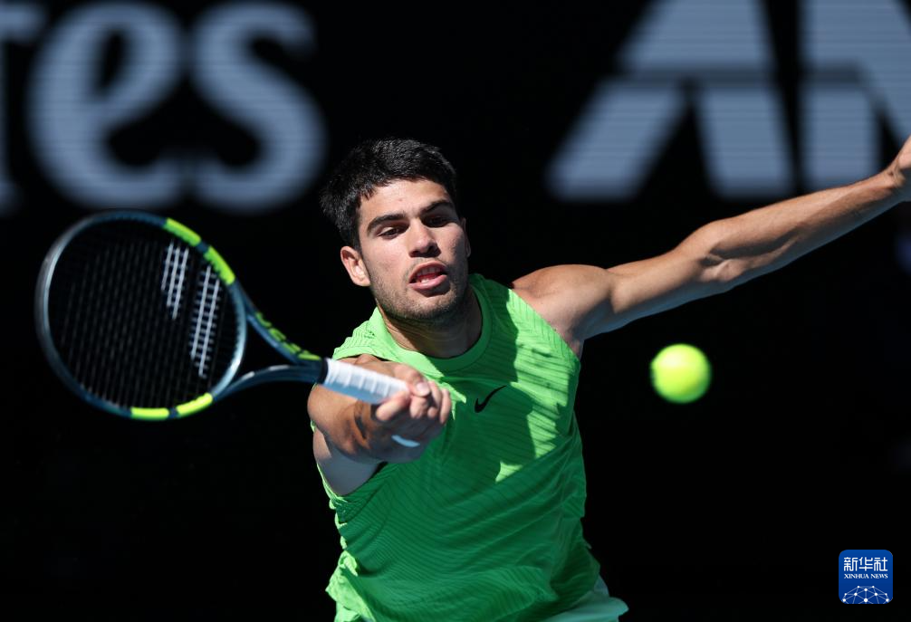 1月21日,西班牙选手阿尔卡拉斯在比赛中回球。