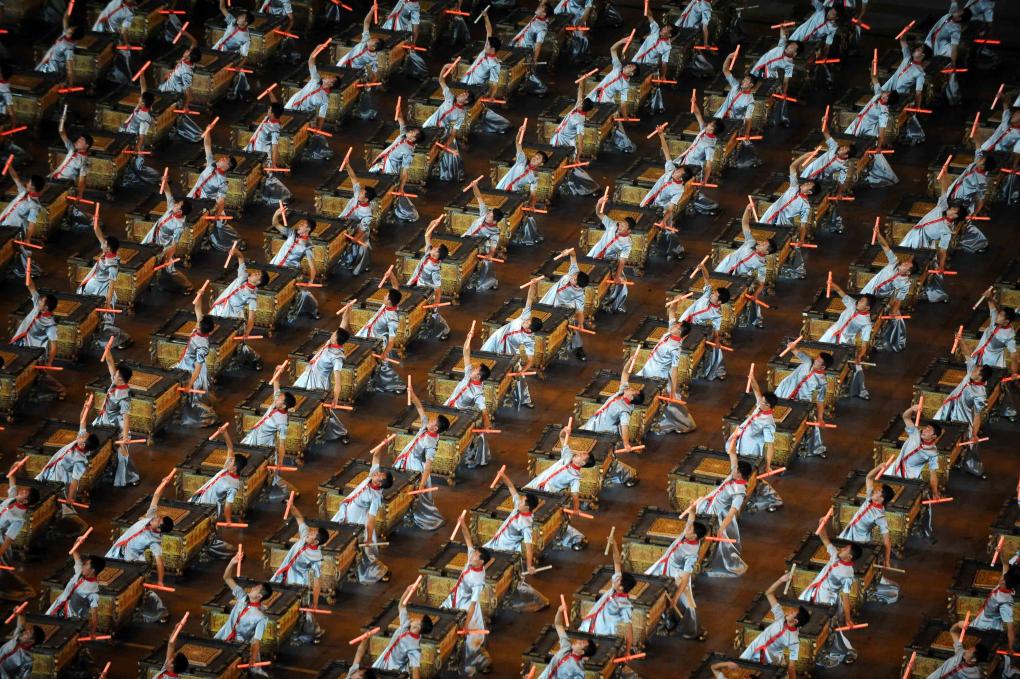 2008年北京奥运会开幕式上,2008名演员在开幕式欢迎仪式开始时击缶而歌,欢迎来自全世界的朋友。新华社记者 杨磊 摄