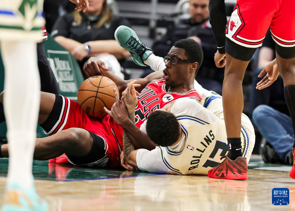 2月3日,公牛队球员史密斯(上)与雄鹿队球员罗林斯在比赛中拼抢。
