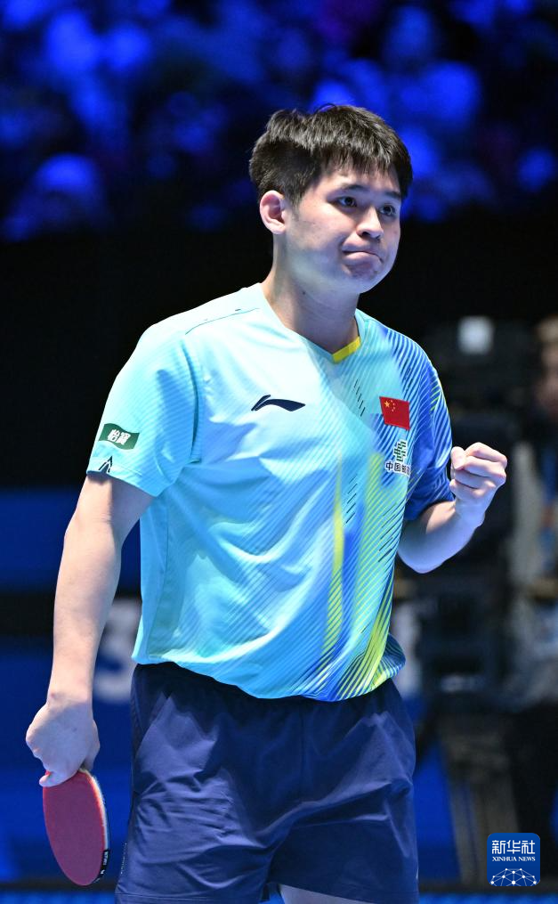 2月4日,林诗栋在比赛中庆祝得分。