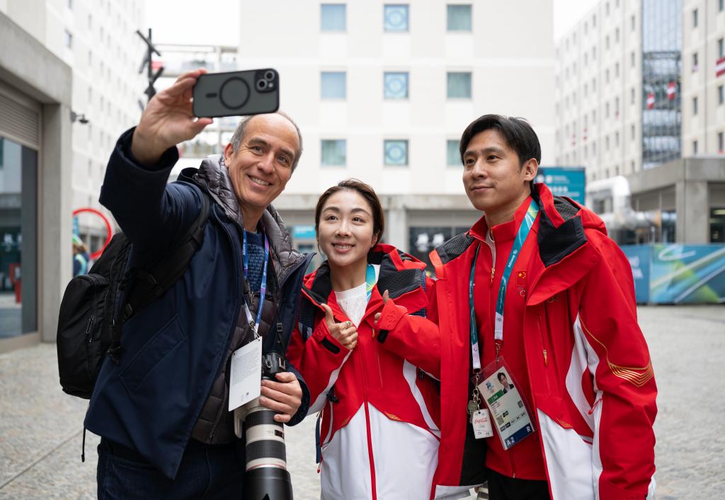 2月3日,在米兰冬奥村,一名记者与中国花滑队运动员隋文静(中)、韩聪(右)自拍留念。新华社记者 张豪夫 摄