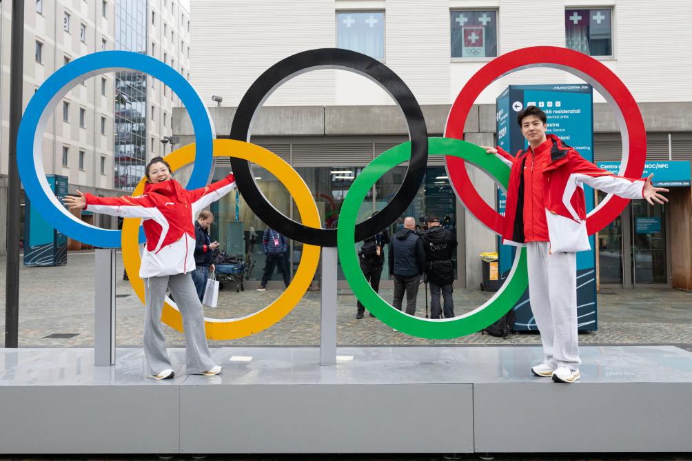 2月3日,在米兰冬奥村,中国花滑队运动员王诗玥(左)、柳鑫宇与奥运五环合影。新华社记者 张豪夫 摄