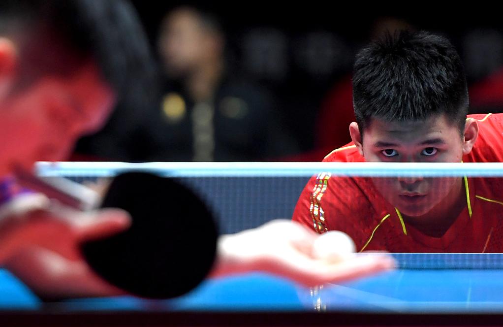 在河南新乡市举行的2021“直通WTT大满贯·世乒赛”暨奥运模拟赛男子单打四分之一决赛中,林诗栋(右)在比赛中准备接樊振东的发球。新华社记者 李安 摄