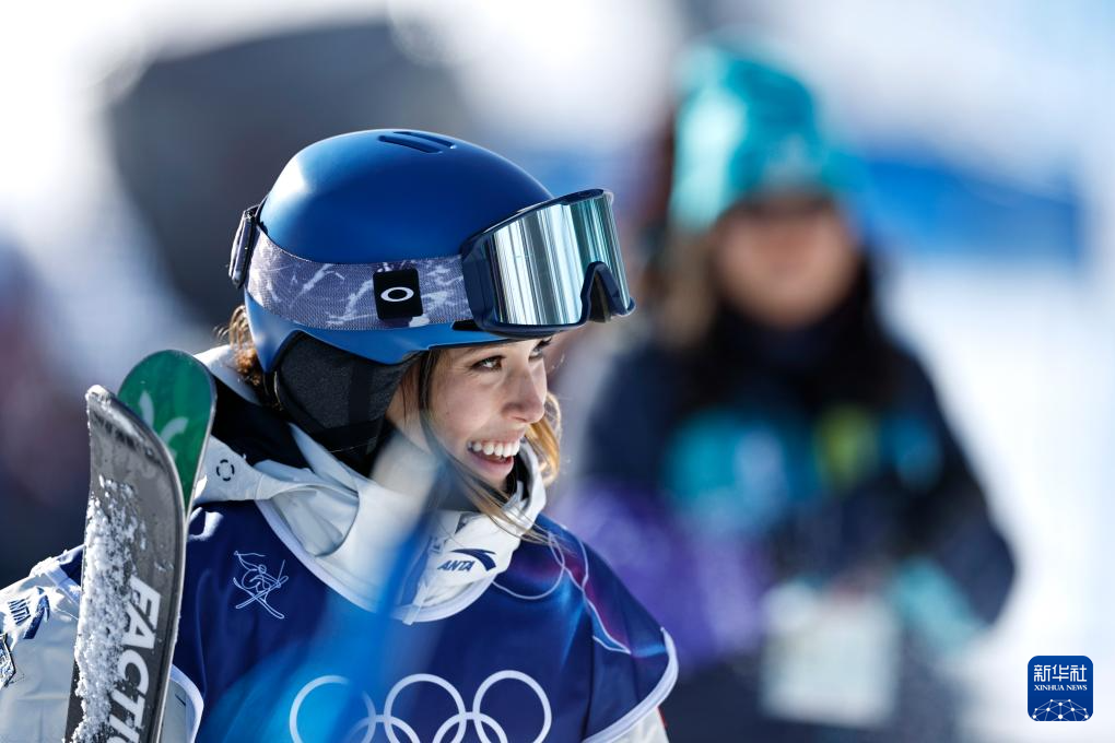 2月7日,谷爱凌(右)在比赛中和母亲交流。