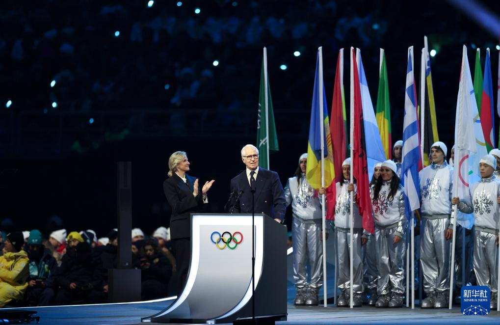 2月6日,米兰-科尔蒂纳冬奥会组委会主席乔瓦尼·马拉戈(前右)在开幕式上致辞。