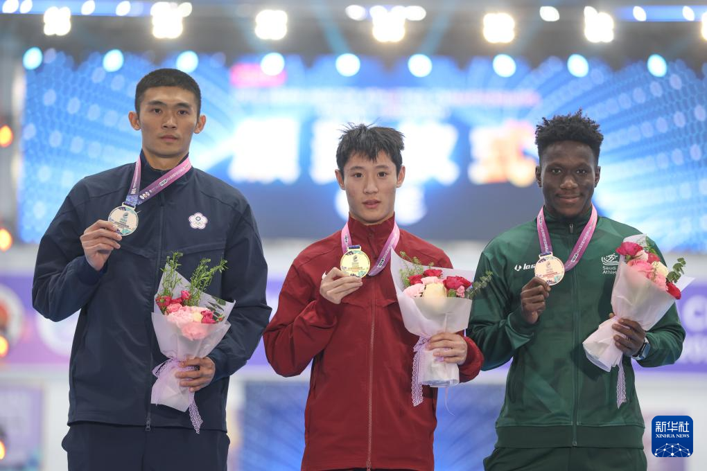 2月7日,冠军中国选手邓信锐(中)、亚军中国台北选手陈玟溥(左)和季军沙特阿拉伯选手阿卜杜拉·默罕默德在男子60米决赛颁奖仪式上。