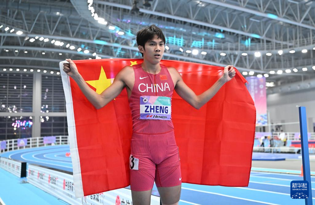 2月7日,男子400米决赛亚军中国选手郑驰宇在比赛后庆祝。