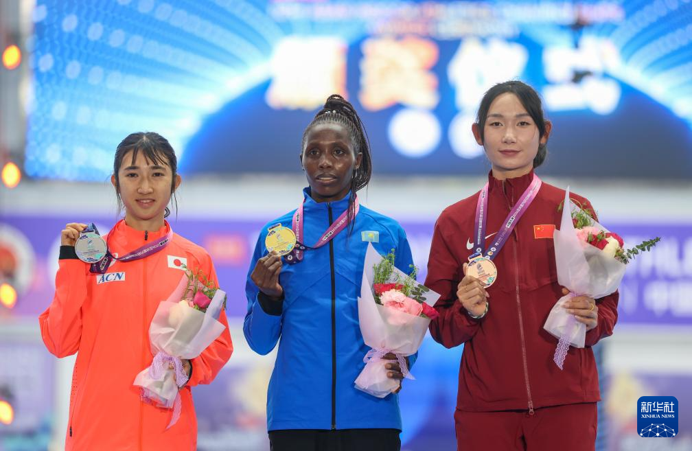 2月7日,冠军哈萨克斯坦选手塔努伊(中)、亚军日本选手田中希实(左)、季军中国选手罗霞在女子3000米决赛颁奖仪式上。