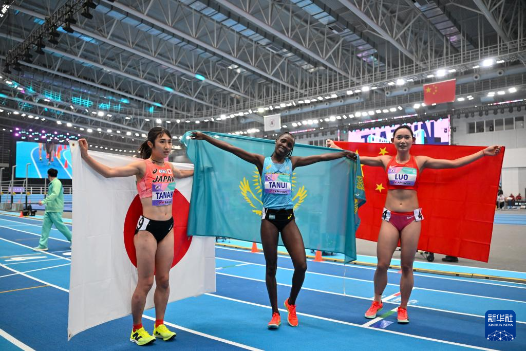 2月7日,冠军哈萨克斯坦选手塔努伊(中)、亚军日本选手田中希实(左)、季军中国选手罗霞在女子3000米决赛后庆祝。