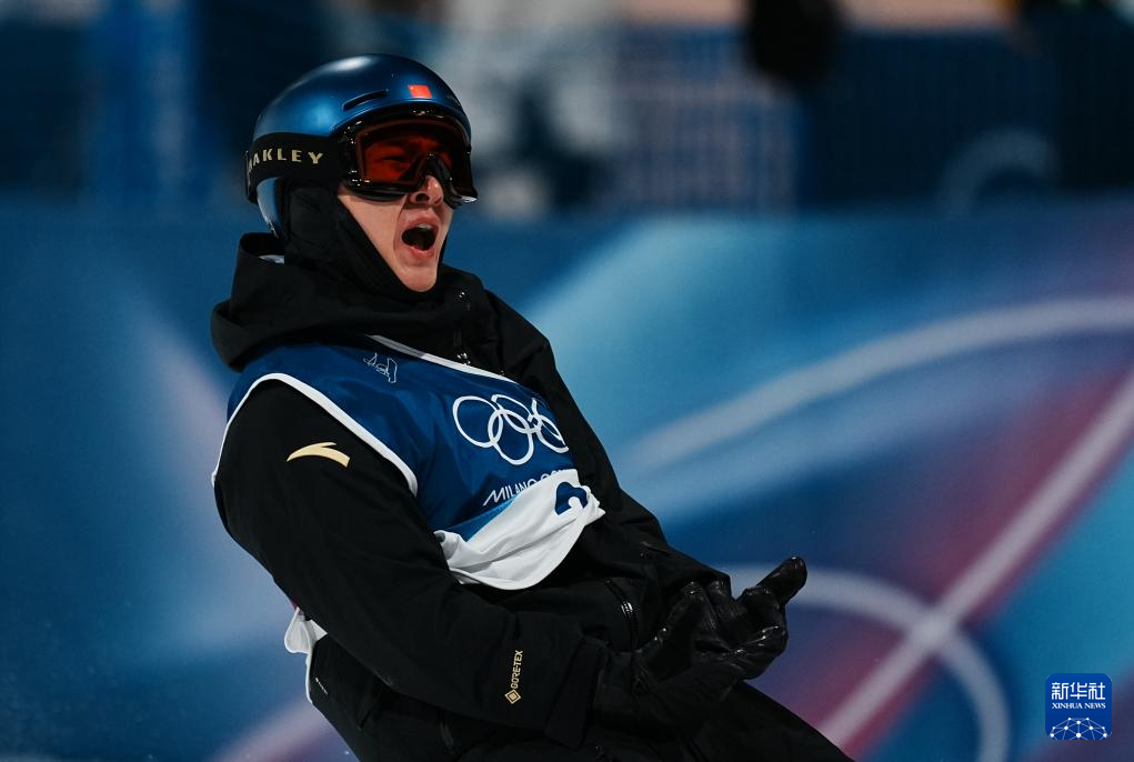 2月7日,中国选手苏翊鸣在第一跳后庆祝。