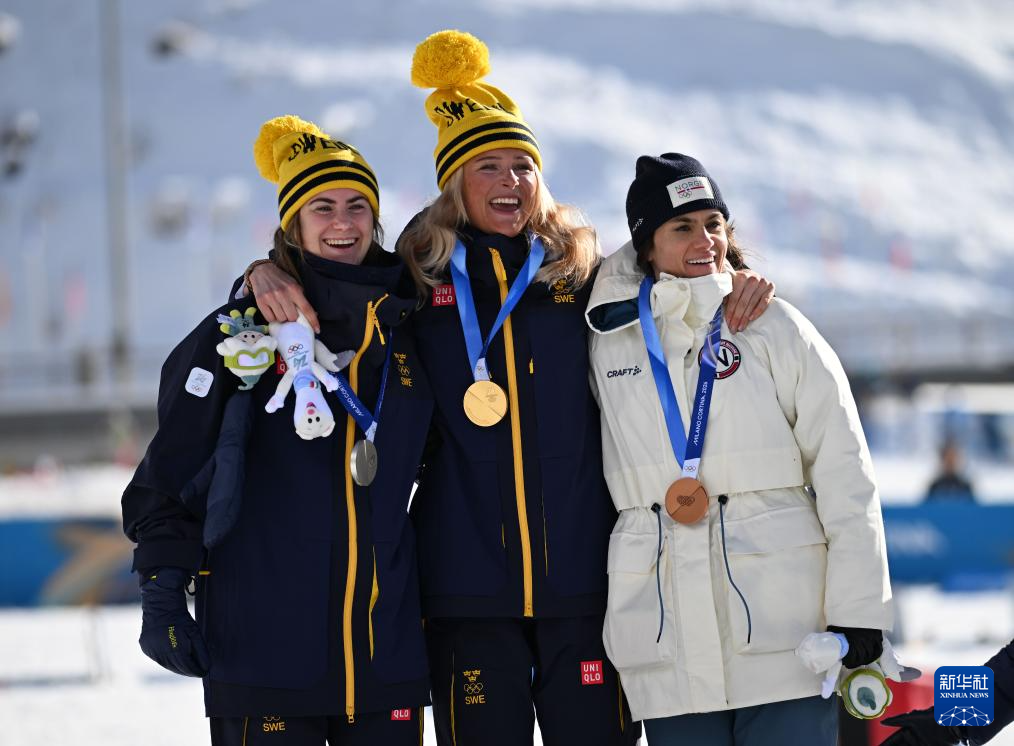 2月7日,冠军瑞典选手弗里达·卡尔松(中)、亚军瑞典选手埃芭·安德松(左)与季军挪威选手海迪·文格在颁奖仪式上。