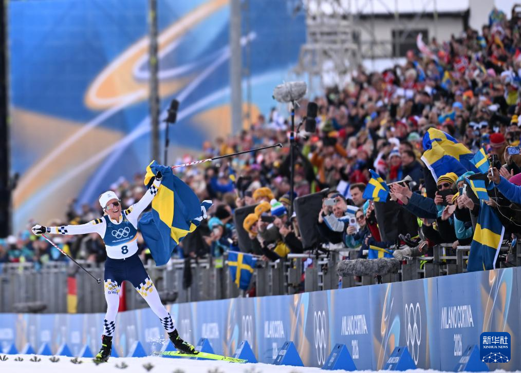 2月7日,亚军瑞典选手埃芭·安德松(左)冲线后与冠军瑞典选手弗里达·卡尔松庆祝。