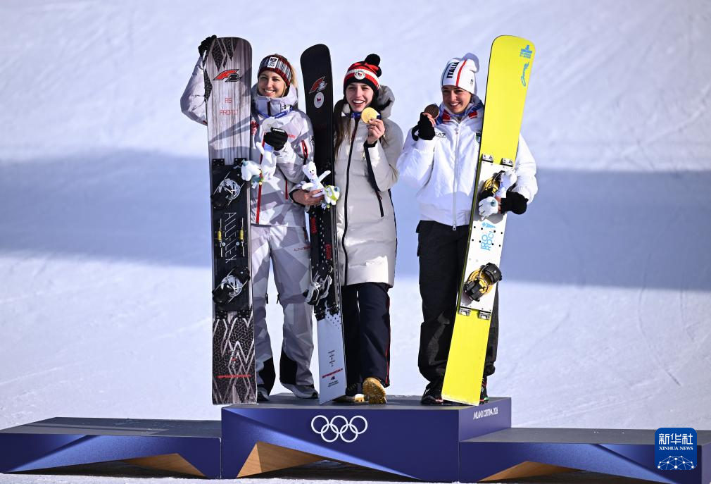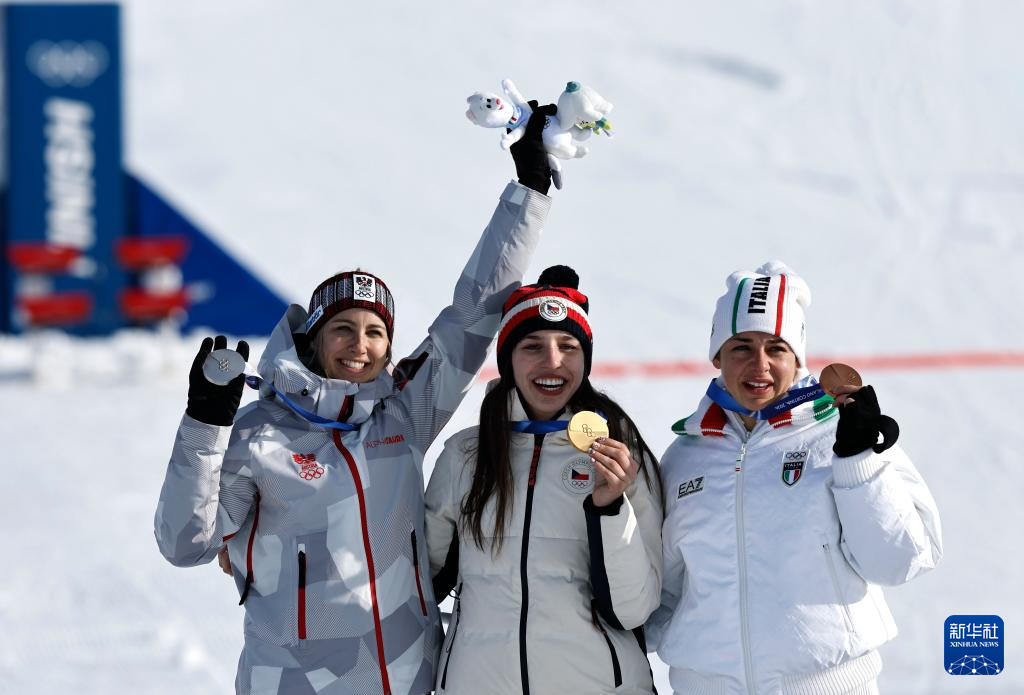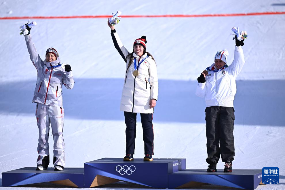 2月8日,冠军捷克选手马德罗娃(中)、亚军奥地利选手帕耶尔(左)、季军意大利选手达尔马索在颁奖仪式上。