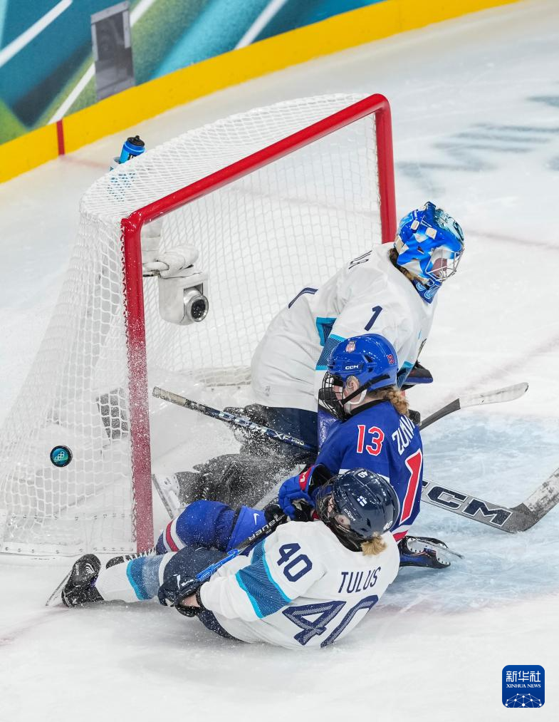 当地时间2月7日,在意大利米兰举行的米兰-科尔蒂纳冬奥会冰球项目女子小组赛A组比赛中,美国队5比0战胜芬兰队。
