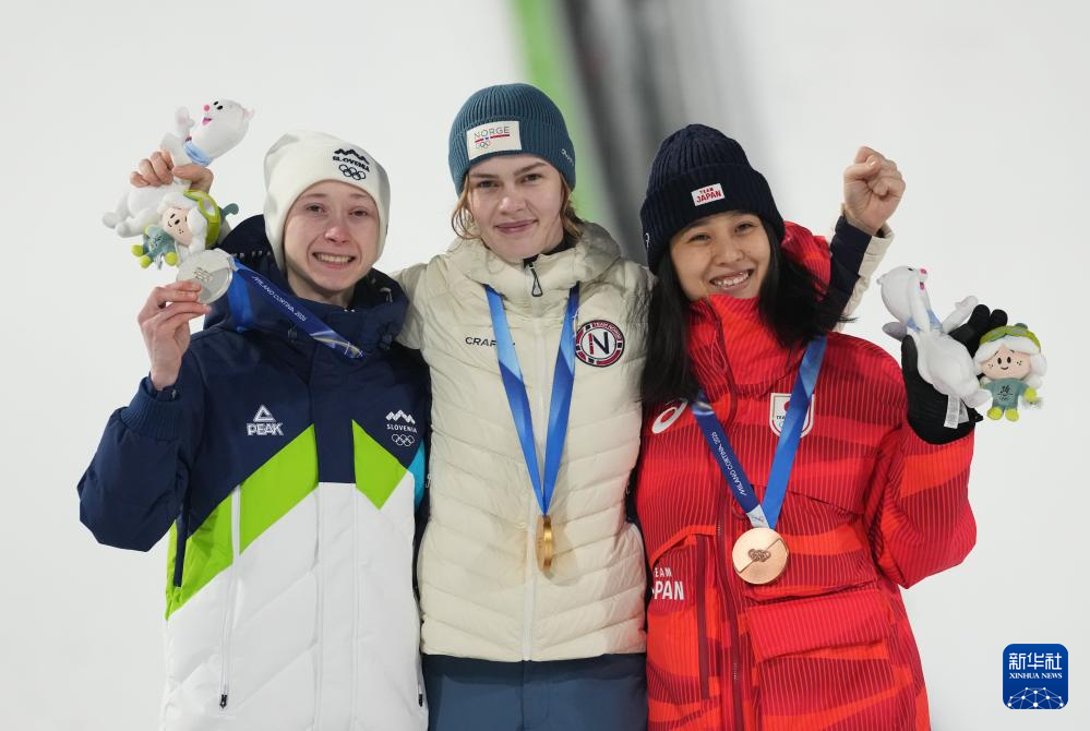 2月7日,冠军挪威选手安娜·奥迪娜·施特勒姆(中)、亚军斯洛文尼亚选手妮卡·普雷夫茨(左)和季军日本选手丸山奈绪美在颁奖仪式上。