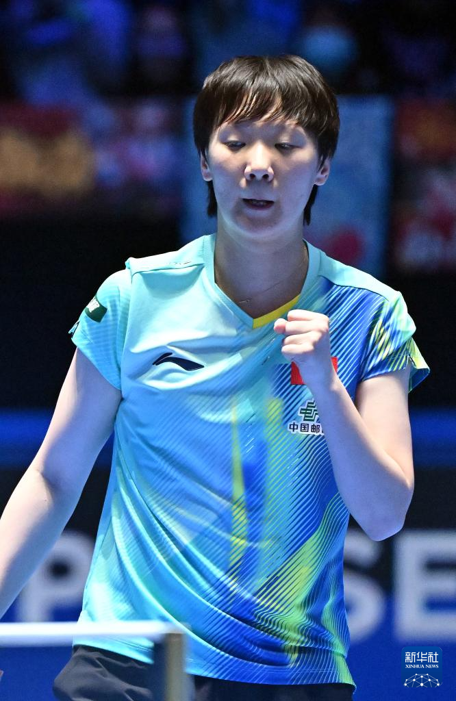 2月8日,孙颖莎在比赛中庆祝得分。