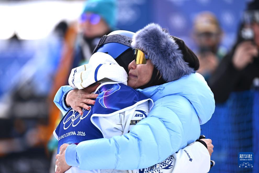 2月9日,中国选手谷爱凌(左)在完成第一跳后和妈妈拥抱。