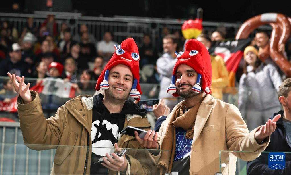 2月9日,法国队球迷头戴巴黎奥运会装饰帽子在赛前加油助威。