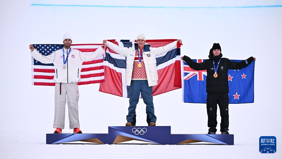 2月10日,冠军挪威选手比尔克·鲁德(中)、亚军美国选手亚历克斯·霍尔(左)和季军新西兰选手卢卡·哈林顿在颁奖仪式上。