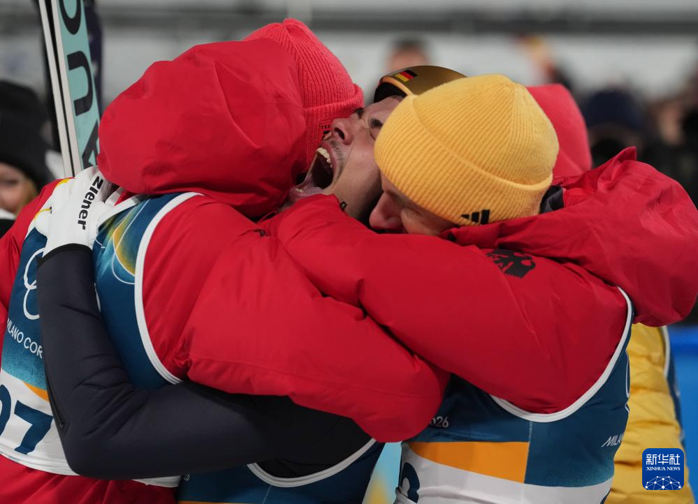 2月9日,德国选手菲利普·雷蒙德(左二)在比赛后庆祝。他获得冠军。