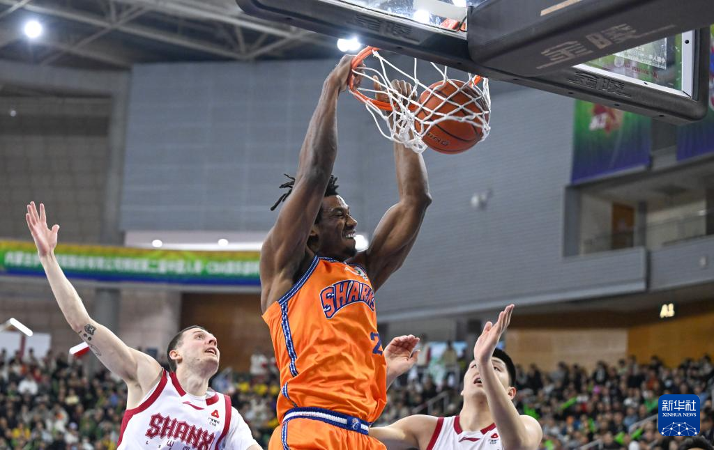 2月12日,上海久事队球员怀特塞德(中)在比赛中扣篮得分。