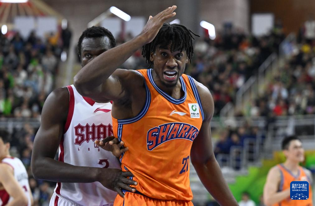 2月12日,山西汾酒队球员迪亚洛(右)在比赛中与裁判沟通。
