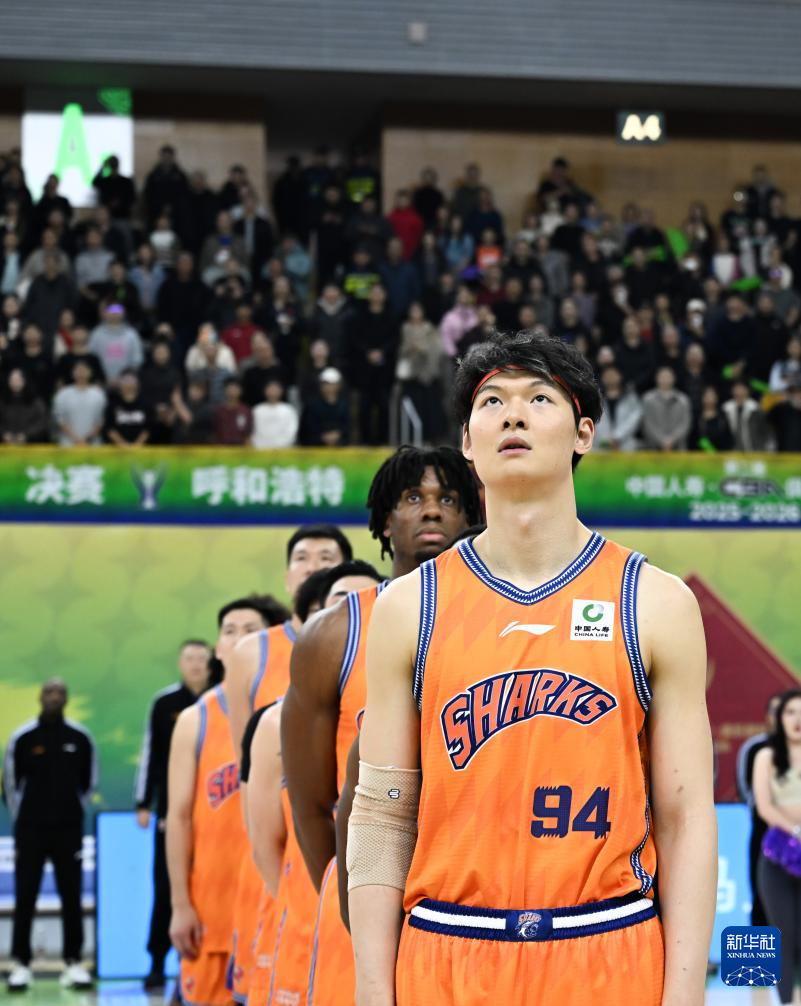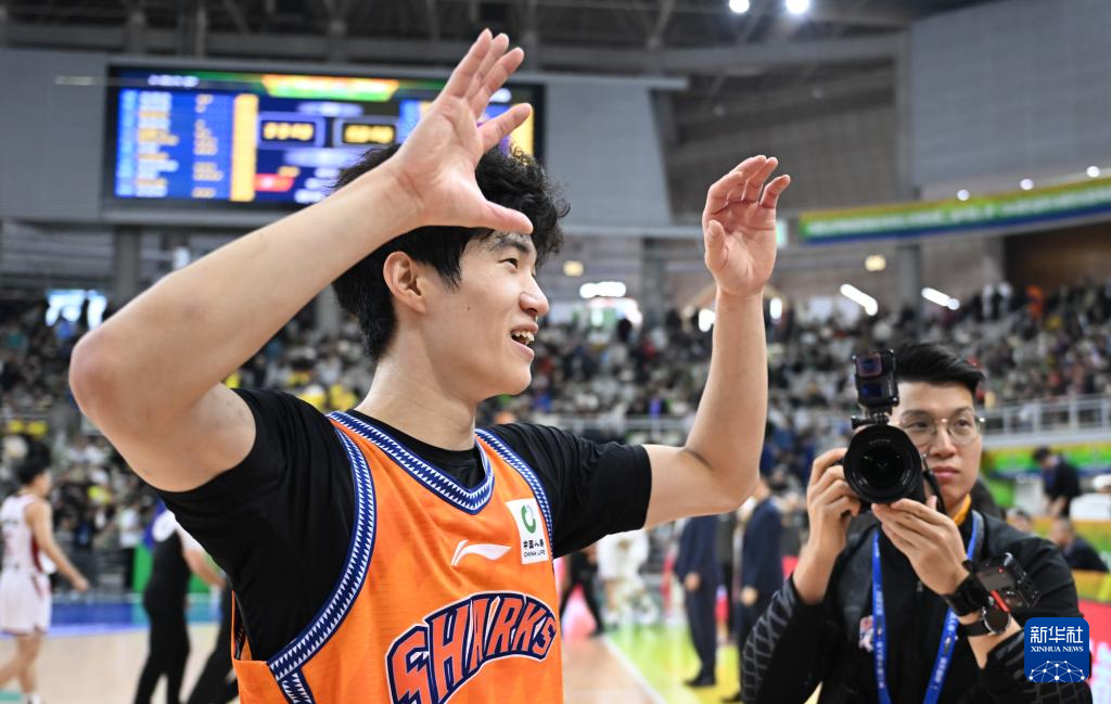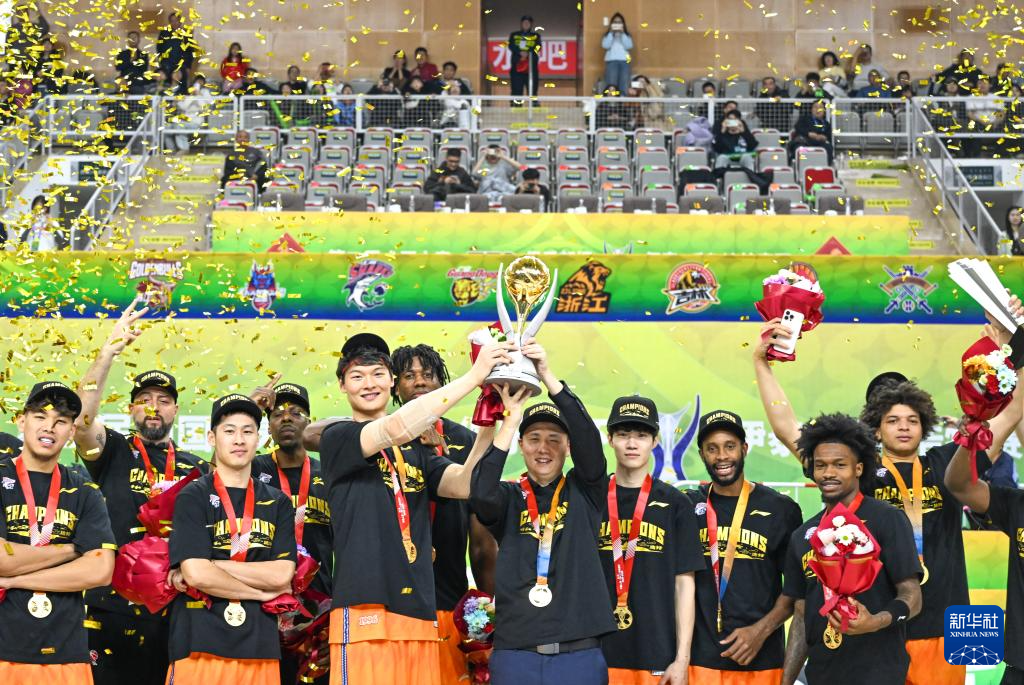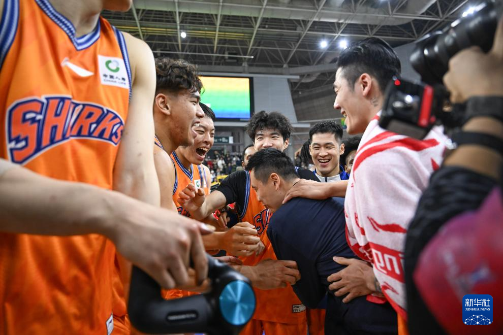 2月12日,上海久事队球员偰李永炜(前)在赛后庆祝夺冠。