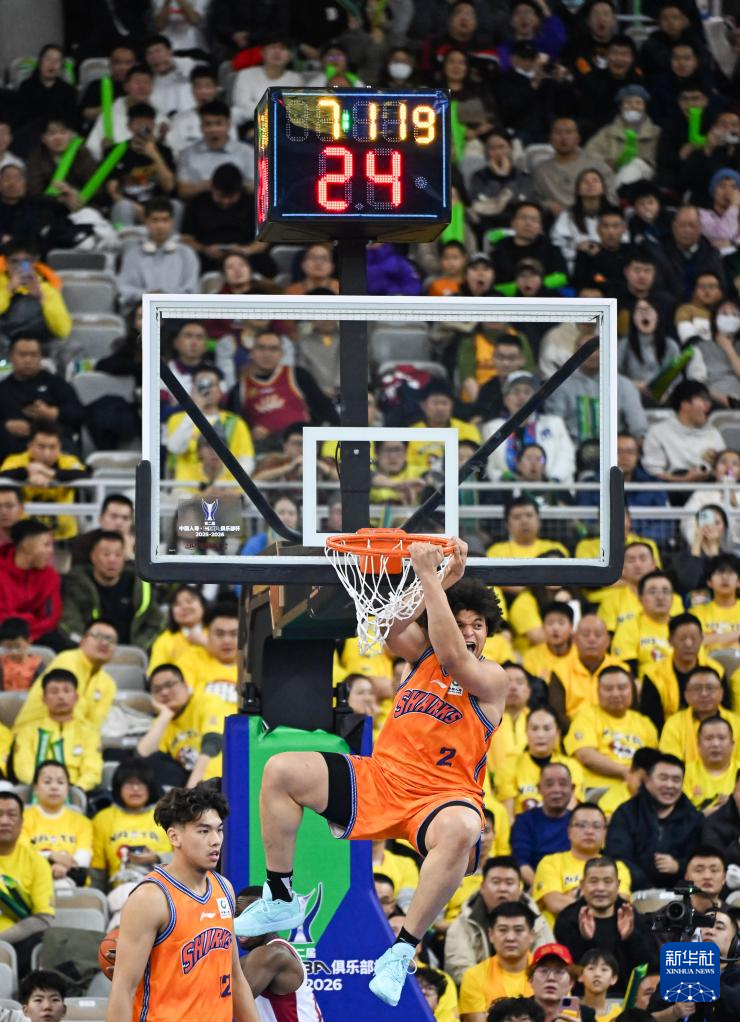 2月12日,上海久事队球员洛夫顿(后)在比赛中扣篮得分。