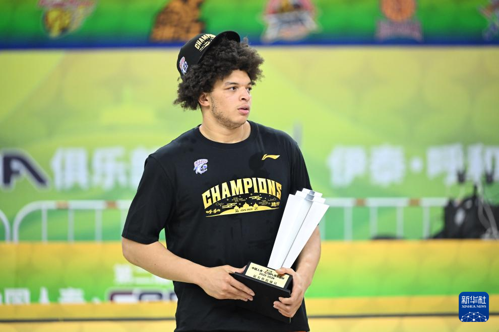 2月12日,上海久事队球员洛夫顿在颁奖仪式上获得最有价值球员(MVP)。