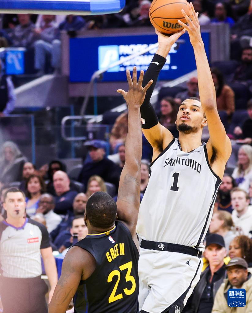 2月11日,马刺队球员文班亚马(右)在比赛中投篮。